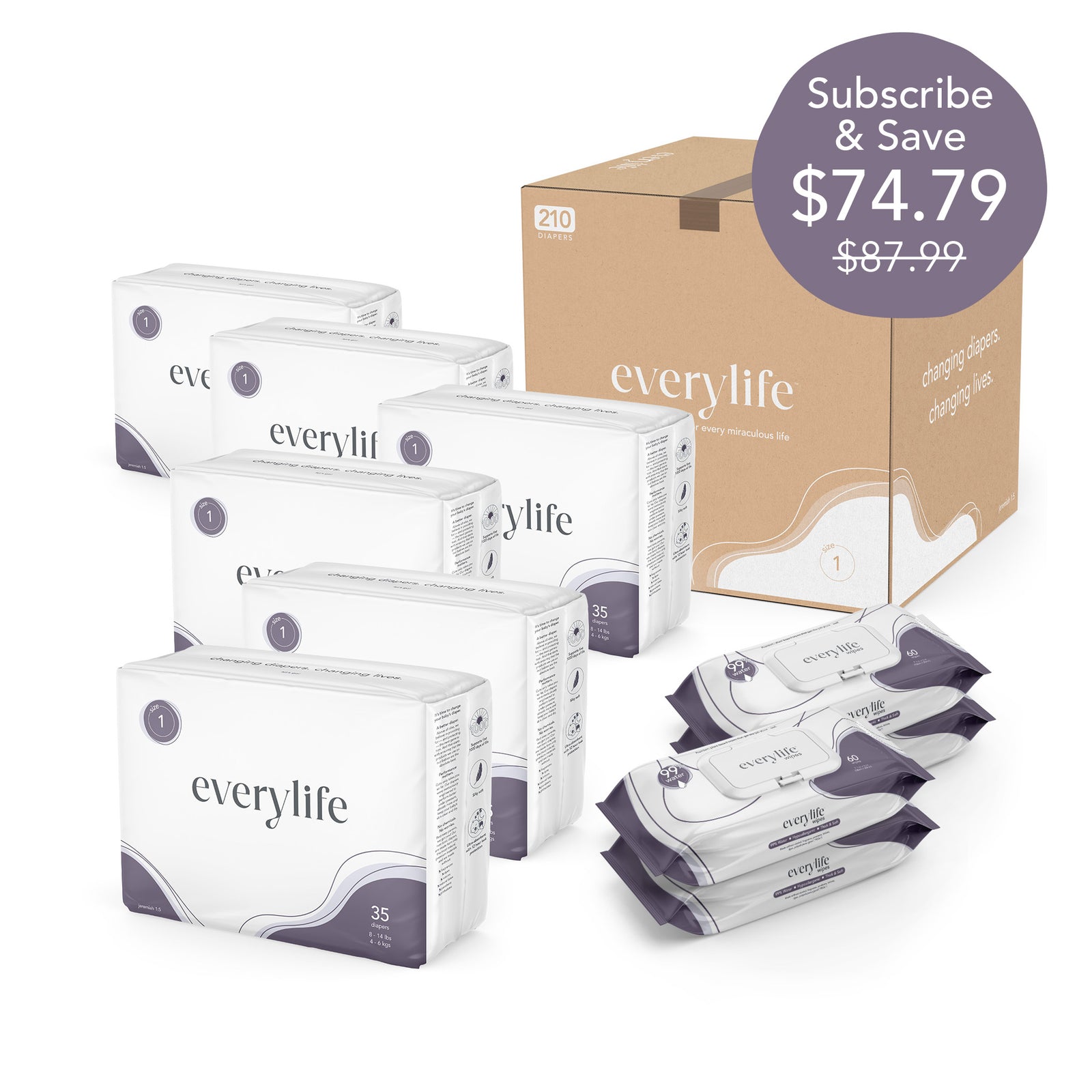 High-performing, premium diapers and wipes. Each box comes with six packs of diapers and four packs of wipes.